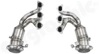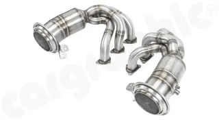 - CARGRAPHIC Fächerkrümmersatz RACING mit 2" / 50,8mm Primärrohrdurchmesser mit 2x200cpsi Ø130mm T-50 OBD HD Tri-Metall Katalysatoren und 2xOPF Ø130mm strömungsoptimiert.