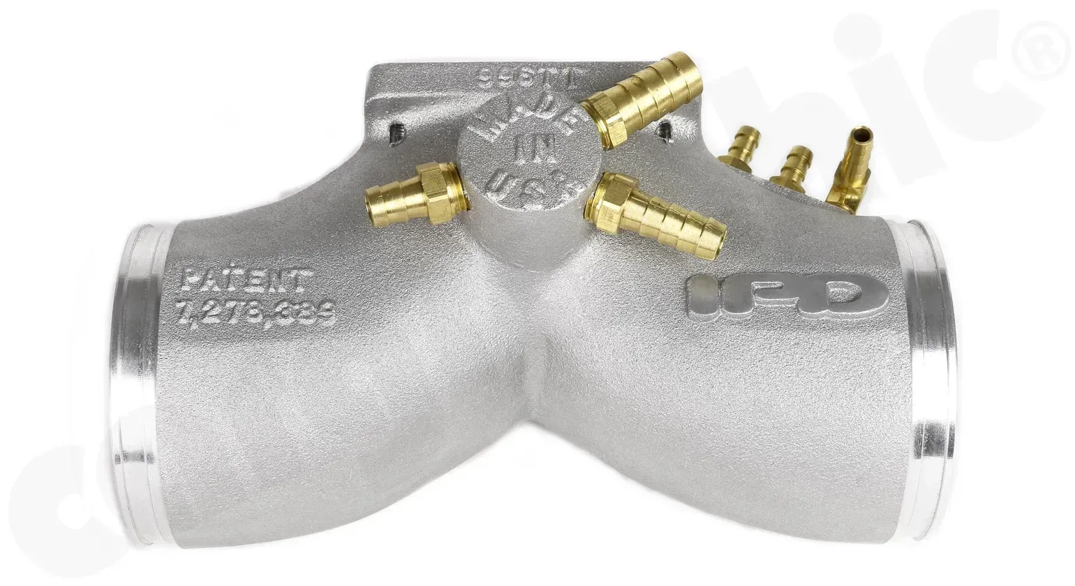 - 1x IPD Intake Plenum - Competition Version, aus gegossenem Aluminium in strömungsoptimierter Y-Form. Zur Verwendung mit optional erhältlicher Ø75mm Drosselklappe