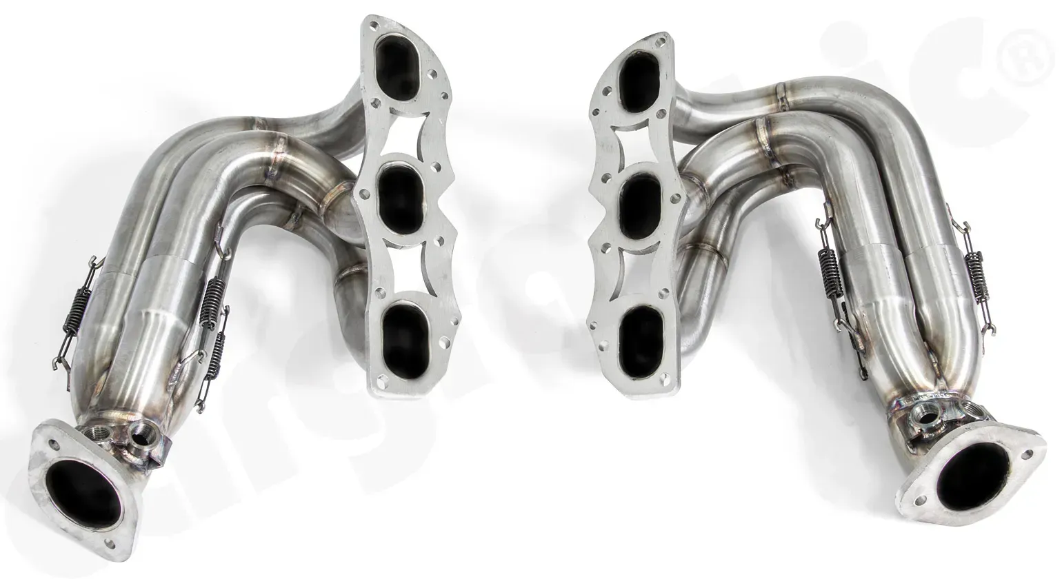 - 2" / 50,8mm extra lange, gleichlange Primärrohre mischen sich in einen "Spliced Racing Style Kollektor mit Spike", welcher federvorbelastet ist, um Vibrationen zu vermeiden und damit Spannungsrissen vorzubeugen sowie einen thermischen Längenausgleich zu gewährleisten