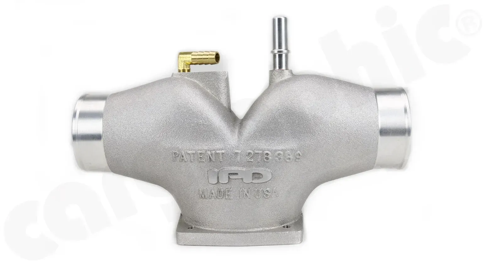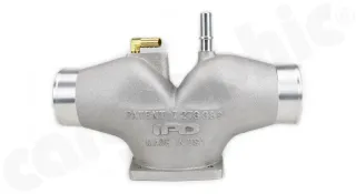 - 1x IPD Intake Plenum, aus gegossenem Aluminium in strömungsoptimierter Y-Form. Zur Verwendung mit Ø74mm Serien-Drosselklappe.